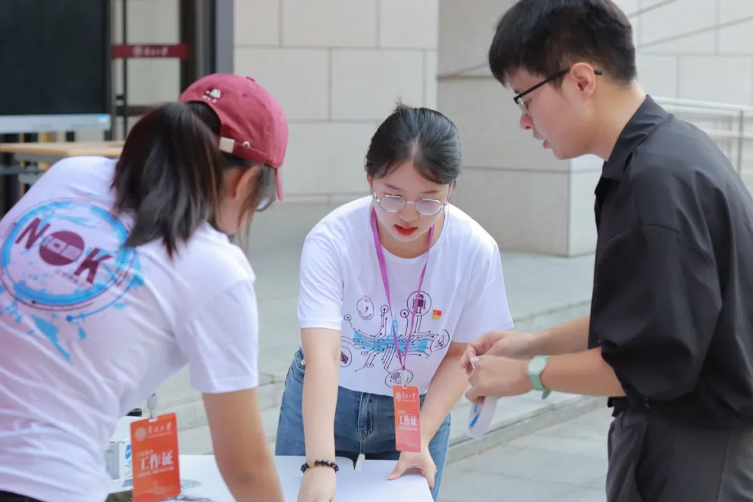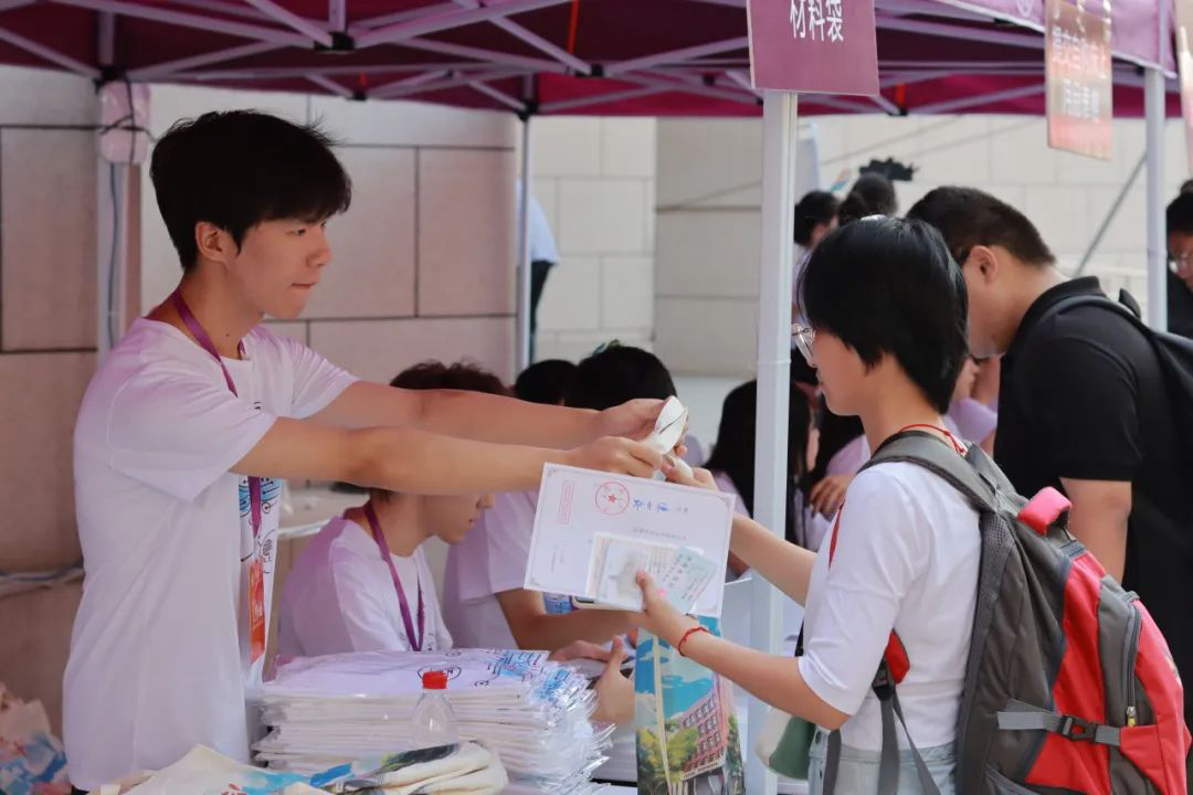 学院多措并举,为新生打造与南开的温暖相遇。一大早,迎新团队的志愿者们早早开启紧锣密鼓的准备工作,擦拭桌椅、摆放物料、梳理流程。大家在学院门口整装待发,满怀期待地等候新生们的到来。上午八点左右,报到现场陆续迎来了2023级新生。新生们在迎新志愿者的指导下有序进行身份核验,顺利领取一卡通、院衫和新材料袋,并在迎新展板前拍照留念。迎新志愿者们热情的微笑、耐心的讲解、贴心的引导成为迎新现场最美丽的画面。