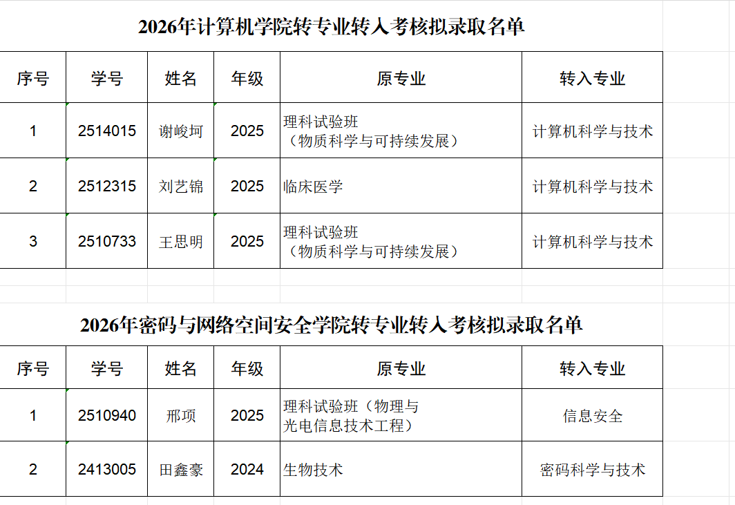 2026年计算机学院、密码与网络空间安全学院转专业考核拟录取名单公示