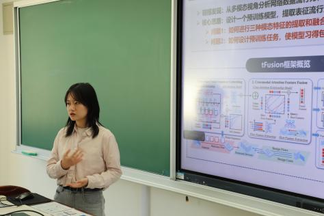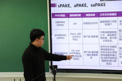 本期现场课设置7个研讨班级,在公教楼C区各教室同步开课。来自北京大学、北京航空航天大学、广州大学、山东大学、澳门城市大学、南开大学、天津大学等国内知名高校的28名同学进行汇报,分享网络空间安全领域的前沿问题和最新成果,汇报课题涵盖人工智能安全、数据隐私保护、密码协议设计与分析、网络通信安全等前沿方向。